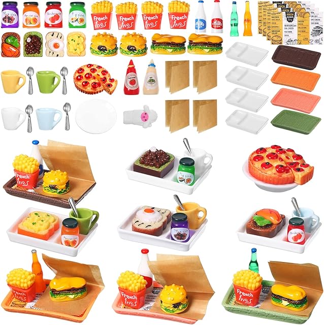 The 50 Pieces Dollhouse Miniature Fast Food Accessories Set Mixed Resin Food Drink Mini Hamburger Fries Juice Milk Bread Jam Cup Doll Kitchen Pretend Play for 1:12 Dollhouse and Cake Toppers Decor