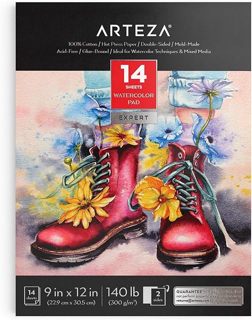 The ARTEZA Watercolor Paper, 14 Sheets, 9×12 Inches Water Pad, 140lb/300gsm, 100% Cotton, Double-Sided, Hot Press, Acid Free Art Paper