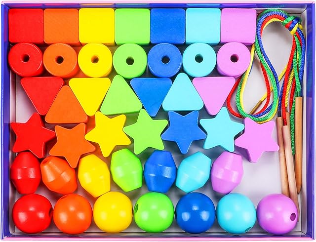 The Atoylink 42PCS Lacing Beads Montessori Toys for Toddlers Wooden Primary String Threading Beads Rainbow Lacing Toy Preschool Fine Motor Skills Educational Toy for 3 4 5 6 7 8 Years Old Kids Boys Girls
