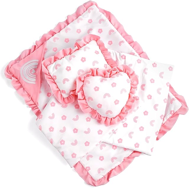 The BABESIDE 4 Pcs Baby Doll Bedding Set for 17-22 Inch Babydolls, Babydoll Bed Accessories Dolls Blankets with Pillows for Reborn Baby Doll Accessories, Pink Flower & Rainbow Patterns