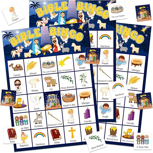 The Bible Bingo Games – 24 Players Christian Bible Bingo Cards – Jesus Sunday School Religious Activities for Family Nativity Easter Party Favors