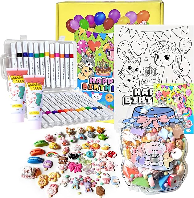 The COOLORCAT Paint Pre-Drawn Canvas Cute Decoden 60+ Charms Craft Kit, 24 Acrylic Markers DlY Art Supplies Arts and Crafts for Kids Ages 6-12 Toys Girls Boys Birthday Gift (Birthday Party)