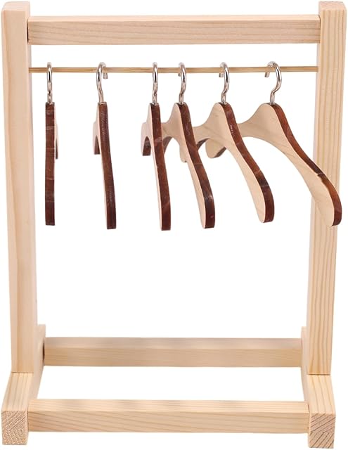 The Doll Garment Rack with Hangers, Wooden Mini Clothes Rack with 6pcs Hangers for 17cm Doll Mini Closet Wardrobe Furniture Accessories for Dollhouse Supplies(Wood Color)