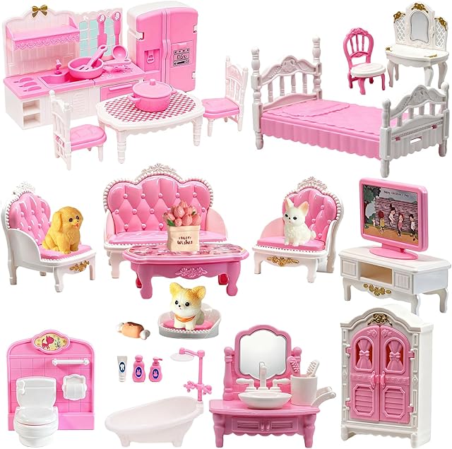 The Dollhouse Furniture Set – 37 Pcs 1:12 Scale Miniature Accessories with Cat,Dog, Kitchen, Bedroom, Living Room & Bathroom – Doll House Accessories and Furniture Toys for Boys Girls Age 3+