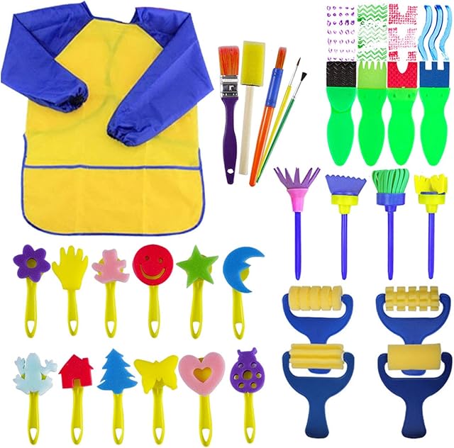 The EVNEED Paint Sponges for Kids,29 pcs of Fun Paint Brushes for Toddlers.Coming with Roller,Flower Pattern Brush, Brush Set, Long Sleeve Waterproof Apron with 3 Roomy Pockets