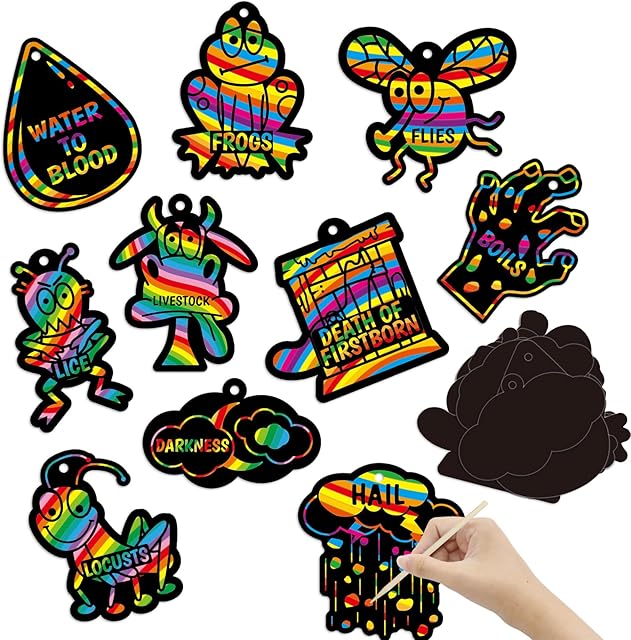 The Fancy Land 60 Pcs Passover 10 Plagues Scratch Paper Art Kit Crafts for Kids Scratch Off Cards DIY Rainbow Hanging Ornament Passover Gifts Decorations Drawing Activities