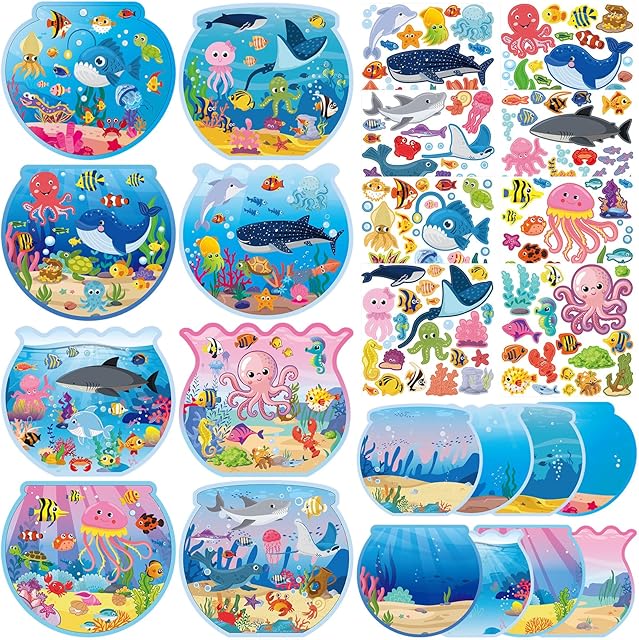 The Frienda 48 Set Summer Craft Kit Fishbowl Under The Sea Sticker Crafts Bulk DIY Ocean Sea Animals Scene Stickers Shark Clown Fish Dolphin Decals for Summer Party Favors Home Classroom Game Activities