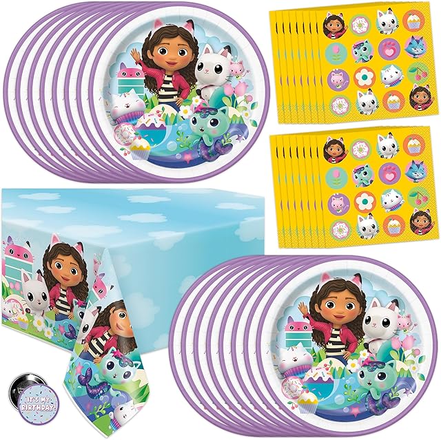 The Gabby Dollhouse Party Decorations | Gabby Dollhouse Birthday Decorations | Tablecover, Plates, Napkins, Button | Serves 16 |