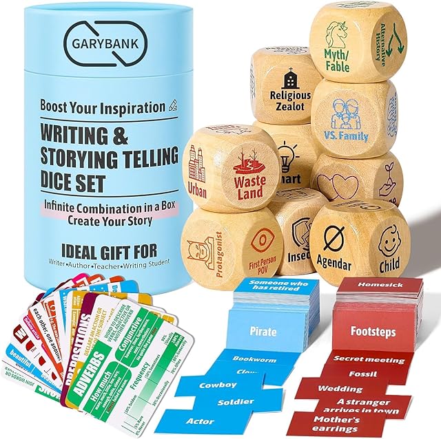 The Garybank Inspiration Writing Prompt Dice – W/13 Writing Skill Cards and 200 Character & Event Cards – Storytelling Game for Kids, Writer & Teachers – Creation Set of 9 Story Cubes – Gifts for Writers