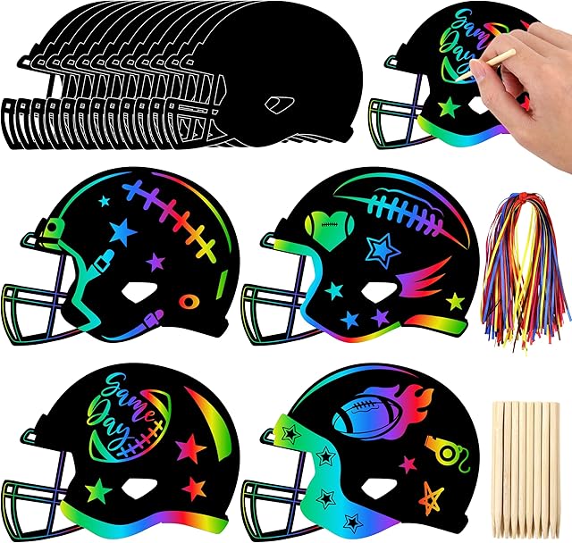 The Geefuun 68Pcs Football Scratch Paper Art for Kids – DIY Helmet Crafts Cards Kit with Wooden Stylus and Ribbons for Party Favors Supplies