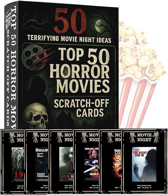 The Horror Movies Scratch Off Cards, Horror Movie Gifts for Movie Night, Movie Night Supplies, Horror Gifts Merch – Premium Top 50 Horror Movies