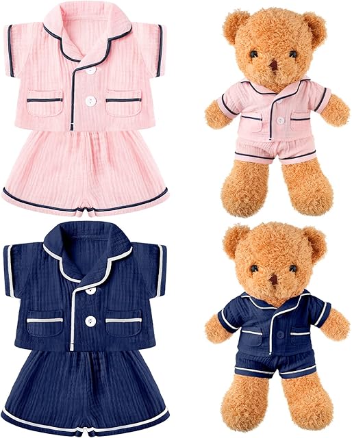 The Hungdao 2 Sets Bear Clothes Stuffed Animal Accessories Pink and Blue Bear Pajamas Clothes Double Layer Muslin Short Sleeve Top and Bottom Pajamas Fits Most 14-18 Inch