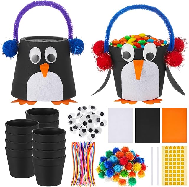 The Jingmore 256 Pcs Penguin Flower Pot Craft Kit DIY Garden Pot Craft Kit with 12 Planters Pipe Cleaners Googly Eyes Glitter Hairballs Hot Glue Sticks for Penguin Party Decor Art Project Storage