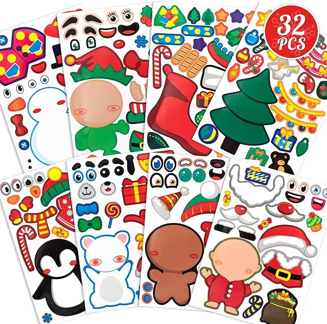 The Mocoosy 32PCS Christmas Make a Face Sticker Sheets for Kids, Make Your Own Christmas Characters Stickers, Xmas Stickers with Elf, Santa, Snowman, Penguin and More Christmas Party Favor Craft Supplies
