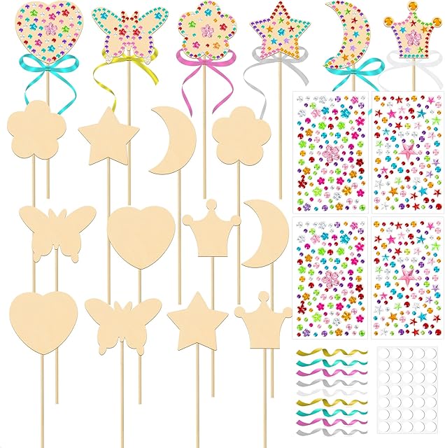 The OPUHOHR 18 Sets Wood Fairy Wands Craft Project Kits, Princess Fairy Wands Kit with Gem Stickers, Ribbons Unfinished Wooden DIY Magical Wand, DIY Crafts Art Projects Gifts for Girls