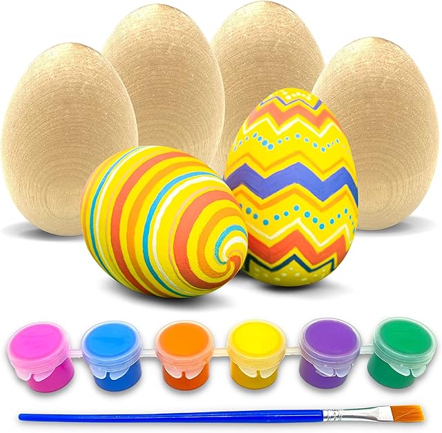 The Perfect Stix Easter Egg Decorating Kit – (6) 2″ Flat-Bottom Wooden Eggs with 6-Color Tempera Paint & Brush – Fun DIY Arts & Crafts for Kids