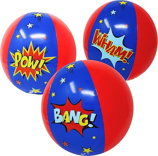 The Podzly 12 Inflatable Superhero Party Beach Balls – 12″ Comic Pow Wham Bang Designs with Secure Valve, Beach Party Favors for Kids, Pool Birthday Water Games Decorations & Gifts, Fun Play for Outdoors