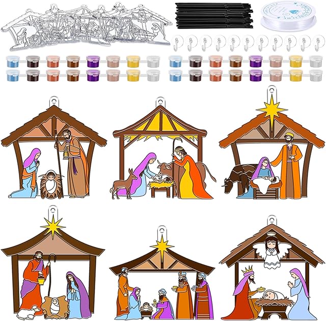 The Poen 24 Sets Nativity Scene Suncatchers Kits Christmas Window Paint Art Suncatchers Crafts Ornaments Decor Sunday School VBS Cross Craft Kits for Holiday Activities Home Party Favors