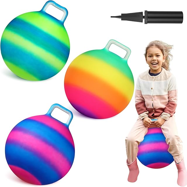 The Poen 3 Pcs 18 Inch Hopper Inflatable Bouncy Ball with Handle Hippity Hop PVC Jumping Hopping Ball with 1 Air Pump for Kids Toddler Boys Girls Gifts Games(Multicolor)