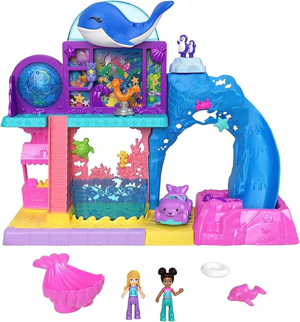 The Polly Pocket Pollyville Aquarium Set With Shani, With Two Dolls, Small Car And 11 Accessories Including 8 Sea Animals, Children’s Toy, From 3 Years, HKW15