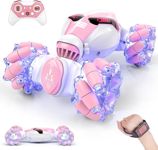 The Powerextra Gesture Sensing Rc Stunt Car with Light & Music for Girls, 4WD Hand Controlled Double Sided 360° Flips Off Road Transform Remote Control Car with LED Light, Toy Gift for Age 8+ Kids, Pink