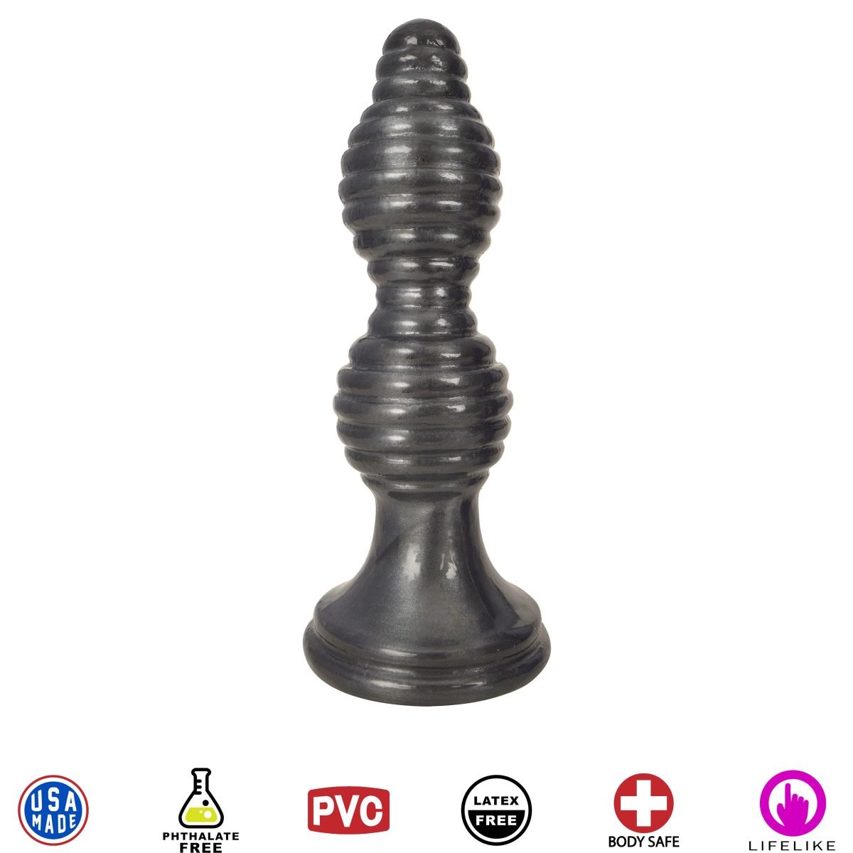 This superbly textured butt plug will give your anus the royal treatment! Thickly ribbed twin spheres massage your sphincter and anal tunnel as they squeeze into your body. The wide, flared suction cup base stays firmly in place as you take it for a ride or play with a partner. Savor every bold ridge and swollen bulb along the considerable length! Made of enhanced PVC, this plug is durable, pliable, low maintenance, and easy to clean. Use with water-based or silicone lubricant. Curve Toys is known for their ultra-realistic bio-skin formula used to create the best dildos and adult toys in the world. They manufacture their adult replica products in the USA with only body-friendly, phthalate-free, and top-grade materials. Their proprietary blend of bio-skin is mixed in-house, making them a leader in sexual health. All products are inspected for superior functionality so that they represent the value, quality, and innovation from the factory to the bedroom. Staffed by experts with over 60 cumulative years in the adult manufacturing, Curve Toys is the perfect combination of passion, creativity and experience; in short, we know pleasure. Measurements: 7 inches in total length, 6 inches insertable length, 1.9 inches at maximum diameter. Material: Phthalate-free PVC. Color: Black. Note: Made in the USA.