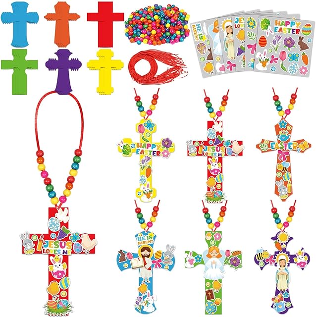 The Qyeahkj 30 Set Easter Cross Necklace Craft Easter Religious Cross Craft Kit for Kids DIY Christian Jesus Arts He is Risen Sticker Hanging Decor Supplies for Sunday School Classroom Party Activities