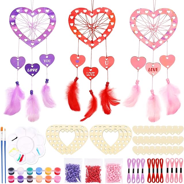 The Sanixin 12 Pack Heart Dream Catcher Craft Kit Valentine Crafts Paint You Own Love Heart Dreamcatcher DIY Coloring Wooden Art and Craft for Activity Project Valentine’s Day Decoration