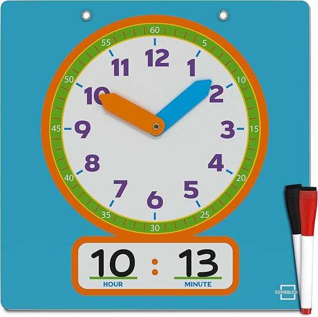 The Scribbledo Writable Dry Erase Learning Clock for Kids Write & Wipe Demonstration Clock for Kids Learning to Tell Time Classrooms and Homeschool Supplies