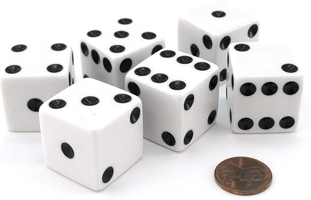 The Set of 6 D6 25mm Large Opaque Jumbo Dice – White with Black Pip by Koplow Games