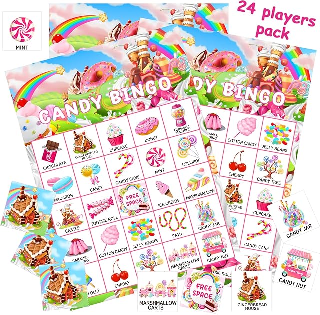The Shappy 35 Pieces Candy Bingo Games 24 Players Candy Party Favors Ice Cream Donut Lollipop Bingo Cards for Sweet Birthday Holiday Party Games Gifts Supplies