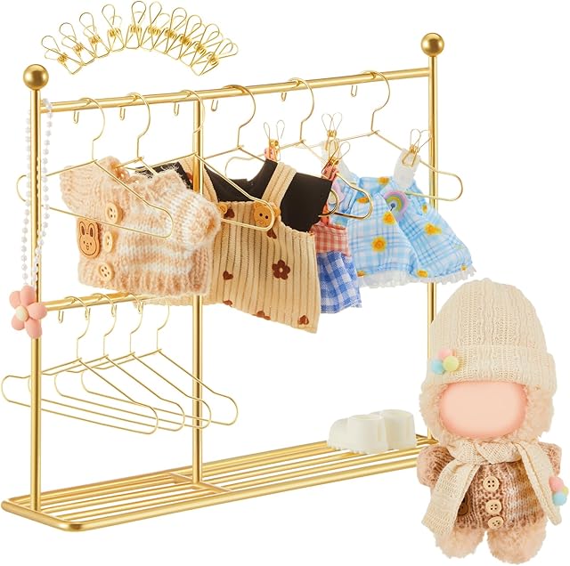 The Skylety Doll Garment Rack for 17 cm Doll Miniature Iron Clothes Rack with 10 Mini Coat Hangers 10 Clips for 1: 12 Scale Dollhouse Furniture Closet Clothing Storage Accessories (Golden)