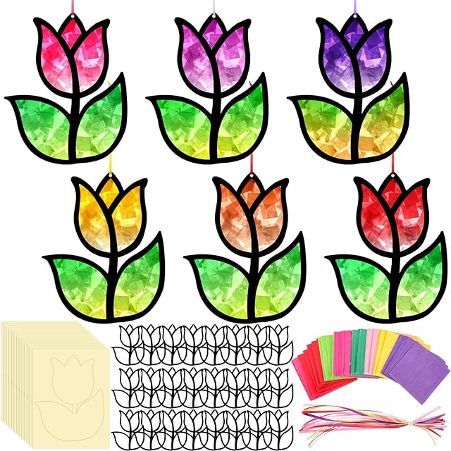 The Supervitae 24 Sets Tulip Crafts Kits Mother’s Day Crafts Spring Flower Paper Sun Catchers Art Kits DIY Tissue Paper Sign Make Your Own Flower Stickers Scene for Mother’s Day Gifts Art Activities