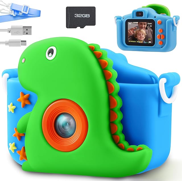 The SYNCFUN Kids Camera, Birthday Gifts for Boys 3 4 5 6 7 8 Year Old, Dinosaur Toys Selfie Toddler Toy, 1080P HD Selfie Digital Video Camera with 32GB SD Card (Dinosaur)