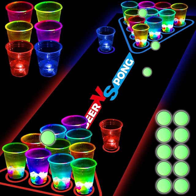 The YHFUISK Glow in The Dark Beer Pong Table Mat, Drinking Game Pong Game with Party Cups, Glow Pongs for Indoor Outdoor Party Game Party Supplies Decoration Flashing&Red&Blue1