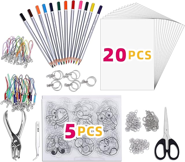 The YUTBES 200 PCS Shrinky Dink Sheets Craft Kit, Includes Kids Shrinky Dink Paper Kit Keychain Making Tools Plastic Art Girls Printable Key Chain DIY Shrink Its Film Kits for Kids Dinks Craft Creations