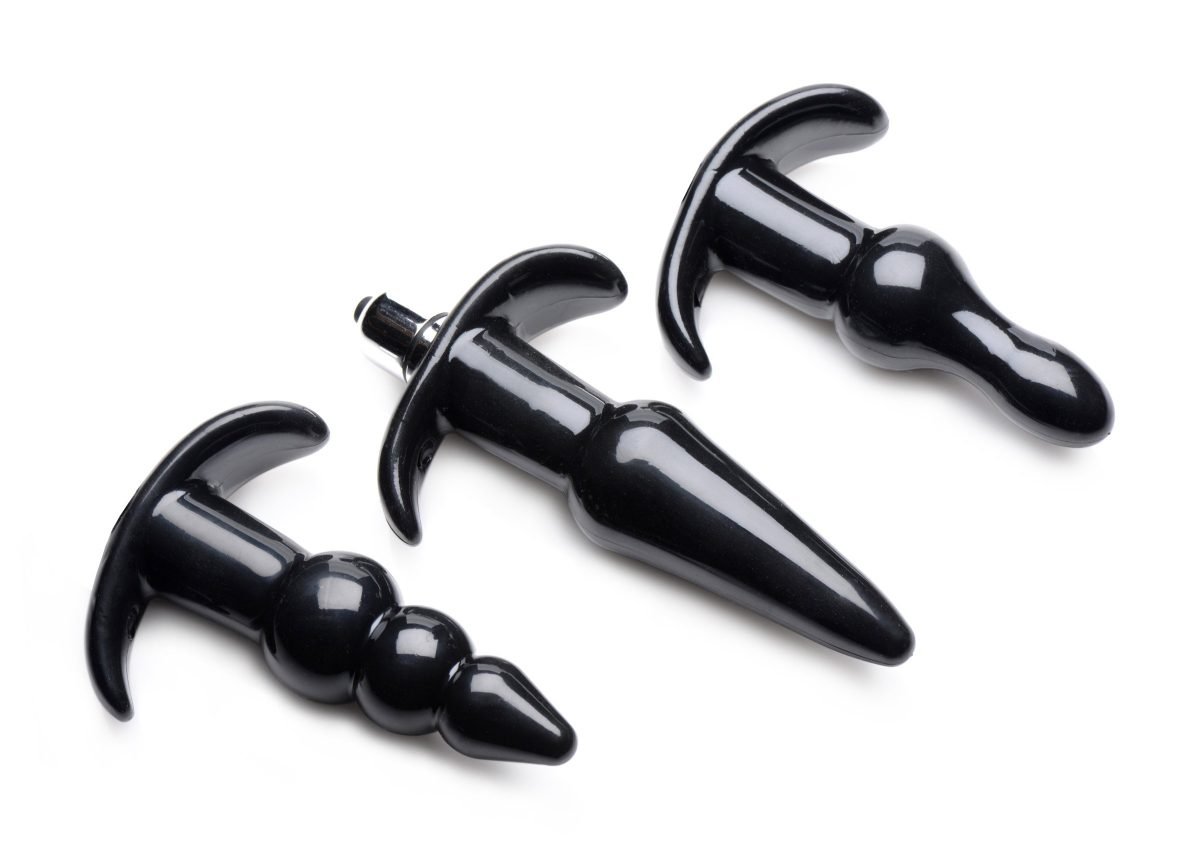 A simple but comprehensive set for the anal curious, this 4 piece kit includes a classically-shaped plug, a smoothly-bulbed design, a ribbed style reminiscent of anal beads, and a one-speed bullet vibe that slips easily into all three of them. Each plug is sleek, with just the right amount of give, and tapered for your comfort. Just slide the petite peanut vibrator into the base of the plug you wish to play with, whether you feel like a classic shape, an exciting bulge, or three pops of pleasure. The easy-to-use button operation makes playtime hassle-free and the contoured bases keep each plug safely and comfortably in place between your cheeks. This firm, yet flexible material is phthalate-free and compatible with water-based and silicone lubricants. The bullet is even waterproof for easy cleaning or use in the shower.