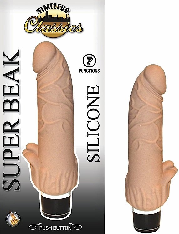 Timeless Classics Collection Super Beak Flesh Vibrator. Realistic vibrator features 7 functions. Push button base. Waterproof vibrations. Phthalates free, RoHS compliant materials: Silicone shaft, ABS plastic base. Vibrating sex toy requires 2 AA batteries, not included. Do not leave batteries in the vibrator between uses. A water based lubricant is recommended. Length: 7.375 inches. Always clean before and after use. Timeless Classics Super Beak Flesh Vibrator by Nasstoys of New York. The Ultimate Love Toy Company.