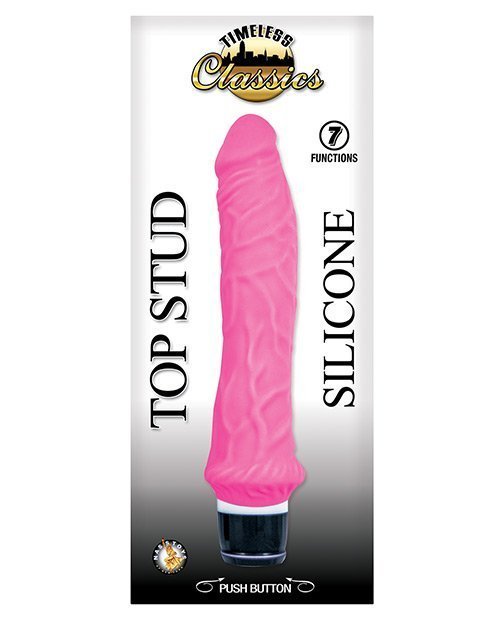 Timeless Classics Collection. Top Stud. 7 functions . Push button base .Waterproof. Color: pink Materials: Silicone, Base – ABS 2 AA batteries, not included Length: 9.5" (H) x 1.77" (W)