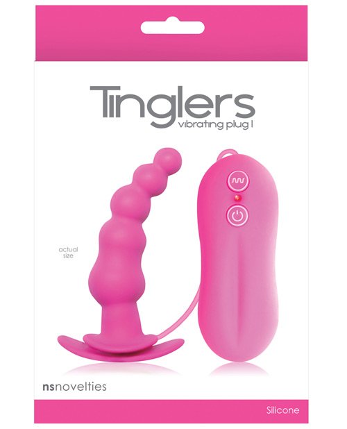 NS Novelties Tingler Vibrating Plug I provides intense and strategically placed vibration exactly where you want it most. The firm yet forgiving silicone body yields to every body type ensuring a comfortable fit. The flat skinny base fits snugly along your body's curves, making it the perfect plug for adventurous couple's play. Each velvety smooth jackpin controller features two buttons for easy on/off operation and 3 levels of intensity control. Vibrating butt plugs require 2 AAA batteries, not included. 4.25 inches by 2.32 inches. Materials Silicone, ABS Plastic.