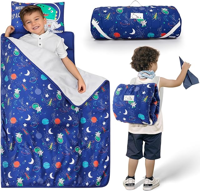 Toddler Nap Mat with Pillow and Blanket, Soft Sleeping Bag for Kids Boys and Girls, Slumber Bags Kids for Preschool, Daycare, Travel, Camping, 54″ x 33″ Great for Ages 3-6