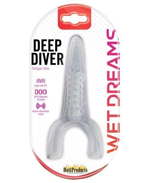 The Wet Dreams Tongue Star Deep Diver Tongue Vibe Clear. This amazing pleasure tongue vibe is expertly designed for an ultra comfortable fit directly onto the teeth. Causes virtually no discomfort or vibration to the mouth or teeth while doing so. So easy to wear, and the Tongue Star Deep Diver will make your lover so easy to please, too. Material: TPE LR754 batteries, Included