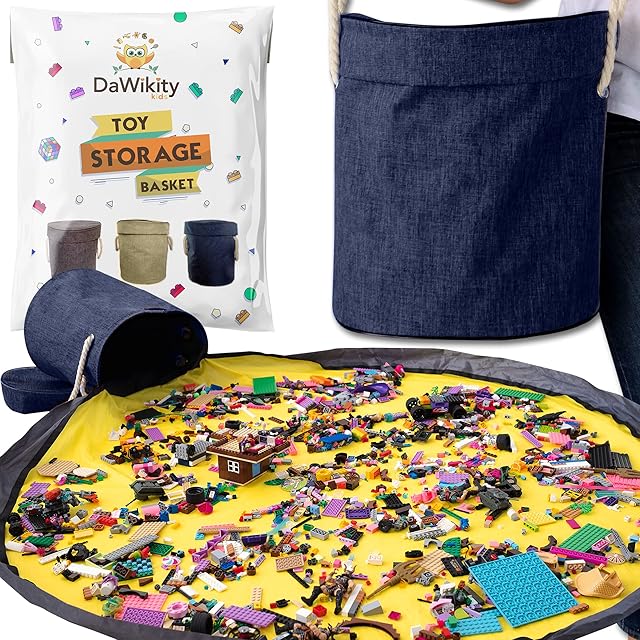 Toy Storage Basket and Play Mat – Building Bricks Toy Storage Organizer – Tidy with Ease – Toy Blocks Mat Storage Bag – Collapsible XL Kids Canvas Bag/Bin – Drawstring Playmat Boy/Girls-15″x14?(NAVY)