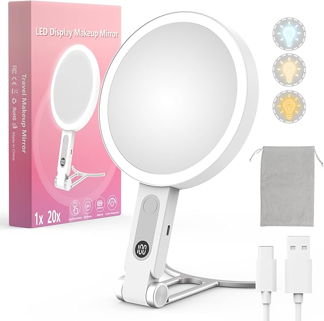 Travel Makeup Mirror with Lights, 1X/20X Magnifying Lighted Makeup Mirror with LED Display ,2-Sided Rechargeable Beauty Mirror with 3 Color Lights & Touch Control, Adjustable Vanity Mirror for Women
