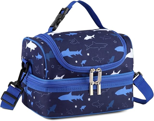 VASCHY Lunch Box Bag Kids, Insulated Two Compartments Cooler Bags for Boys Girls w Shoulder Strap for School,Daycare,Kindergarten,Picnic Shark