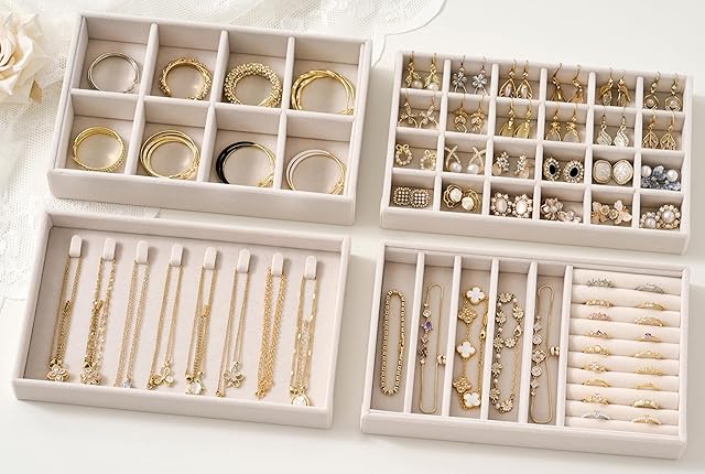 Velvet Jewelry Drawer Organizer Trays – Beige Stackable Jewelry Storage Inserts Set, 4-Layer Jewelry Tray Set for Earrings, Rings, Necklaces, Bracelets with Removable Dividers for Dresser & Vanity