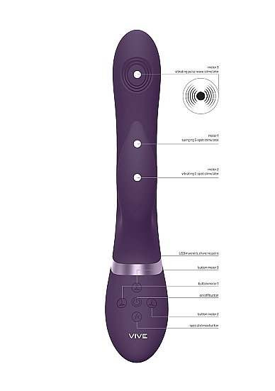 Vive Aimi Pulse Wave and G-Spot Rabbit Vibrator Purple from Shots Toys. Aimi is one of the most innovative and powerful vibrators on the market today. Thanks to its three innovative 10 function New Generation F1 motors and its advanced technologies. All three motors can be Independently controlled. It is truly top of the bill! The vibrating tip contains a 10 function New Generation F1 Pulse Wave Motor for G-Spot stimulation. Simultaneously contains a unique 10 function NG F1 vibrating motor for clitoral stimulation. It vibrates and moves side to side, so it will leave you breathless! In total, this toy offers 100 different combinations. Made from 100% silky smooth medical grade Silicone hypoallergenic. It is totally waterproof IPX7. Extremely quiet at under 60dB. This means you can use it wherever your heart desires. It contains a USB magnetic rechargeable Lithium ion battery, and fully charged will provide 40 minutes of passionate play time. Just plug, charge and play! When you are getting close to climax, just one touch on the special function climax button will immediately bring all the motors to full power. And more importantly, bring you to an earth shattering orgasm. All Vive Vibrators have a full 1 year warranty to protect your investment. Specifications: dimensions package 4.21 inches by 3.03 inches by 9.53 inches. Weight package 8.64 ounces. Product dimensions 8.78 inches by 1.69 inches. Insertable length 4.53 inches. Quantity motors 3. Speed modes 10. Multi speed. Noise level 60 dB. Rechargeable vibrations. Rechargeable time 180 minutes. Recharged battery life time 40 minutes. Waterproof vibrations. Splashproof. Phthalate free materials ABS Plastic, Silicone.