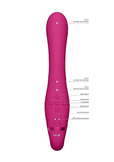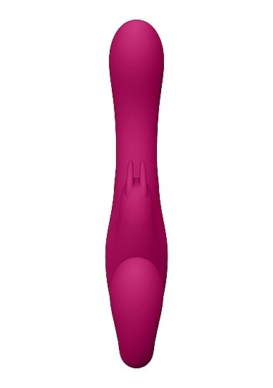 Vive Suki Pink Rabbit Vibrator from Shots Toys. Suki is one of the most Innovative and best vibrating strapless strap on the market. You can use it your partner while being stimulated yourself for the best of both worlds. With three 10 function New Generation F1 Motors and its advanced technologies. All three motors can be independently controlled. Two Innovative 10 function NG F1 Vibrating Motor for your partner. One NG F1 vibrating motor for clitoral stimulation. One NG F1 vibrating motor for G-Spot stimulation and finally but not least one 10 function NG F1 motor for your G-Spot. It is sure to bring you both to maximum heights of pleasure. This means you can setup your toy with up to 1,000 distinctive settings. Made from 100% silky smooth medical grade Silicone hypoallergenic. It is totally waterproof IPX7 and extremely quiet at under 60db.This means you can use it wherever your heart desires! It contains a USB magnetic rechargeable Lithium ion battery, that when fully charged with its USB cable, it will provide 40 minutes of passionate playtime. Just plug, charge and play! When you are getting close to climax, just one touch of the special function climax button will immediately bring all the motors to full power and more importantly, bring both of you to an earth shattering orgasm. All Vive vibrators have a full 1 year warranty to protect your investment. Weight package 7.65 ounces. Product dimensions 8.66 inches by 3.62 inches. Insertable length 4.72 inches. Quantity motors 3. Speed modes 10. Multi-speed. Noise level 60 dB. Rechargeable vibrations. Rechargeable time 180 minutes. Recharged battery life time 40 minutes. Waterproof vibrations. Splashproof. Phthalate free body safe materials ABS, Silicone.