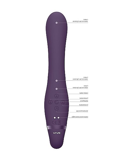Vive Suki Purple Rabbit Vibrator from Shots Toys. Suki is one of the most Innovative and best vibrating strapless strap on the market. You can use it your partner while being stimulated yourself for the best of both worlds. With three 10 function New Generation F1 Motors and its advanced technologies. All three motors can be independently controlled. Two Innovative 10 function NG F1 Vibrating Motor for your partner. One NG F1 vibrating motor for clitoral stimulation. One NG F1 vibrating motor for G-Spot stimulation and finally but not least one 10 function NG F1 motor for your G-Spot. It is sure to bring you both to maximum heights of pleasure. This means you can setup your toy with up to 1,000 distinctive settings. Made from 100% silky smooth medical grade Silicone hypoallergenic. It is totally waterproof IPX7 and extremely quiet at under 60db.This means you can use it wherever your heart desires! It contains a USB magnetic rechargeable Lithium ion battery, that when fully charged with its USB cable, it will provide 40 minutes of passionate play time. Just plug, charge and play! When you are getting close to climax, just one touch of the special function climax button will immediately bring all the motors to full power and more importantly, bring both of you to an earth shattering orgasm. All Vive vibrators have a full 1 year warranty to protect your investment. Weight package7.65 ounces. Product dimensions 8.66 inches by 3.62 inches. Insertable length4.72 inches. Quantity motors 3. Speed modes 10. Multi-speed. Noise level 60 dB. Rechargeablevibrations. Rechargeable time 180 minutes. Recharged battery life time 40 minutes. Waterproofvibrations. Splashproof. Phthalate free body safe materials ABS, Silicone.