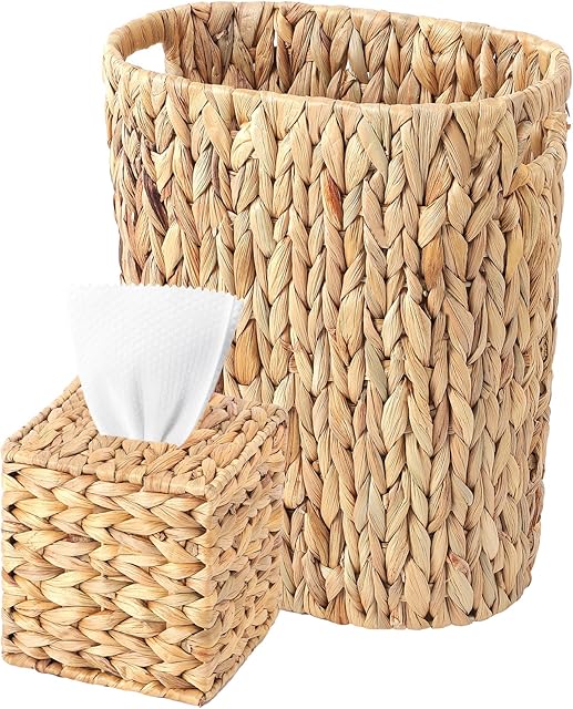 Water Hyacinth Trash Can 15L & Wicker Square Tissue Box, Handwoven Waterproof Waste Basket with Handles, Wicker Home Set for Bedroom, Bathroom, Kitchen, Office, Balcony (Khaki)
